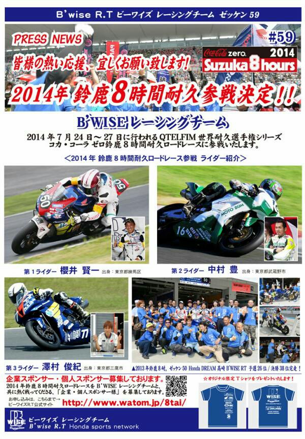 よければ今回のB''WISEレーシングチームのサポートよろしくお願いいたします!!