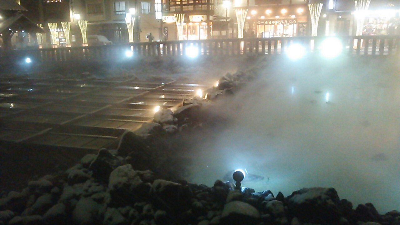 終わってからはしもーだ君も合流して、ペンションの夕飯食べて、湯畑へ